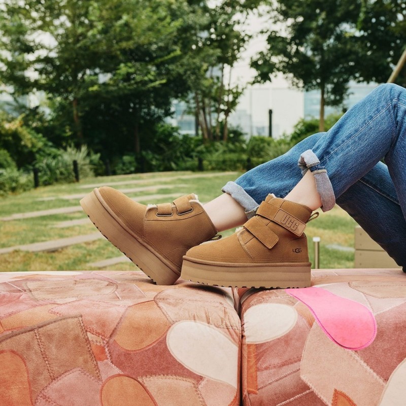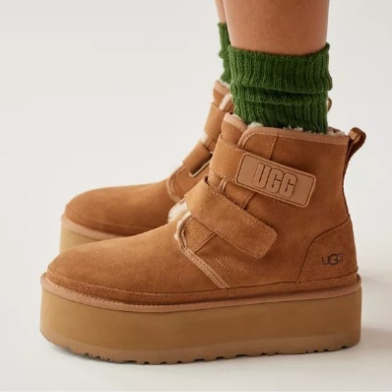 人気のチャッカブーツNeumelを再構築し、約5cmのプラットフォームソールでアップデートしたNeumel Platform(ニューメル プラットフォーム)。オリジナルと同じスエードに加え、UGG®のシグネチャーであるUGGplush™ウールブレンドのライニングが施され、厚底ソールでもクッション性が高く、ソフトな履き心地が特徴です。面ファスナー仕様のストラップで簡単に着脱できます。